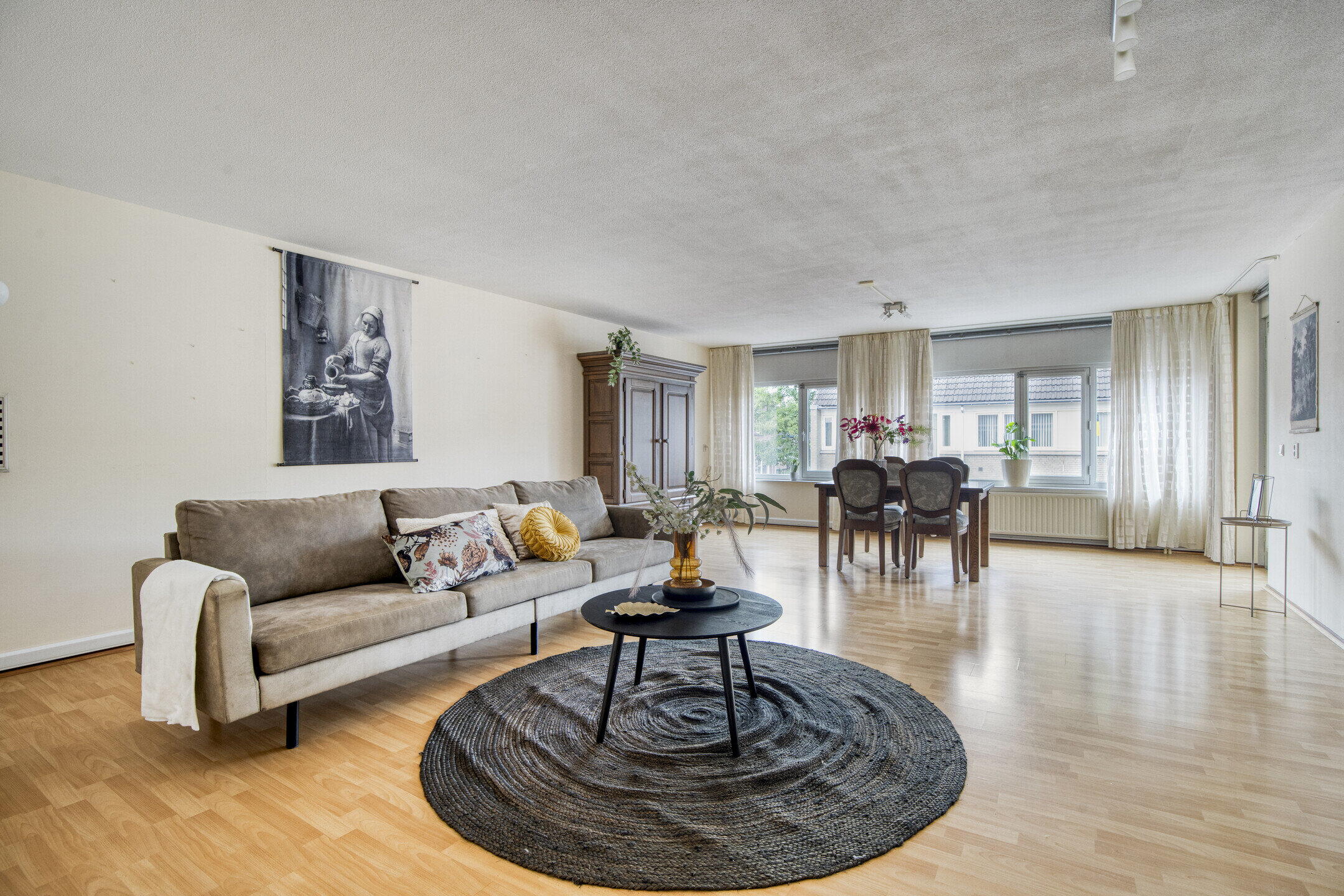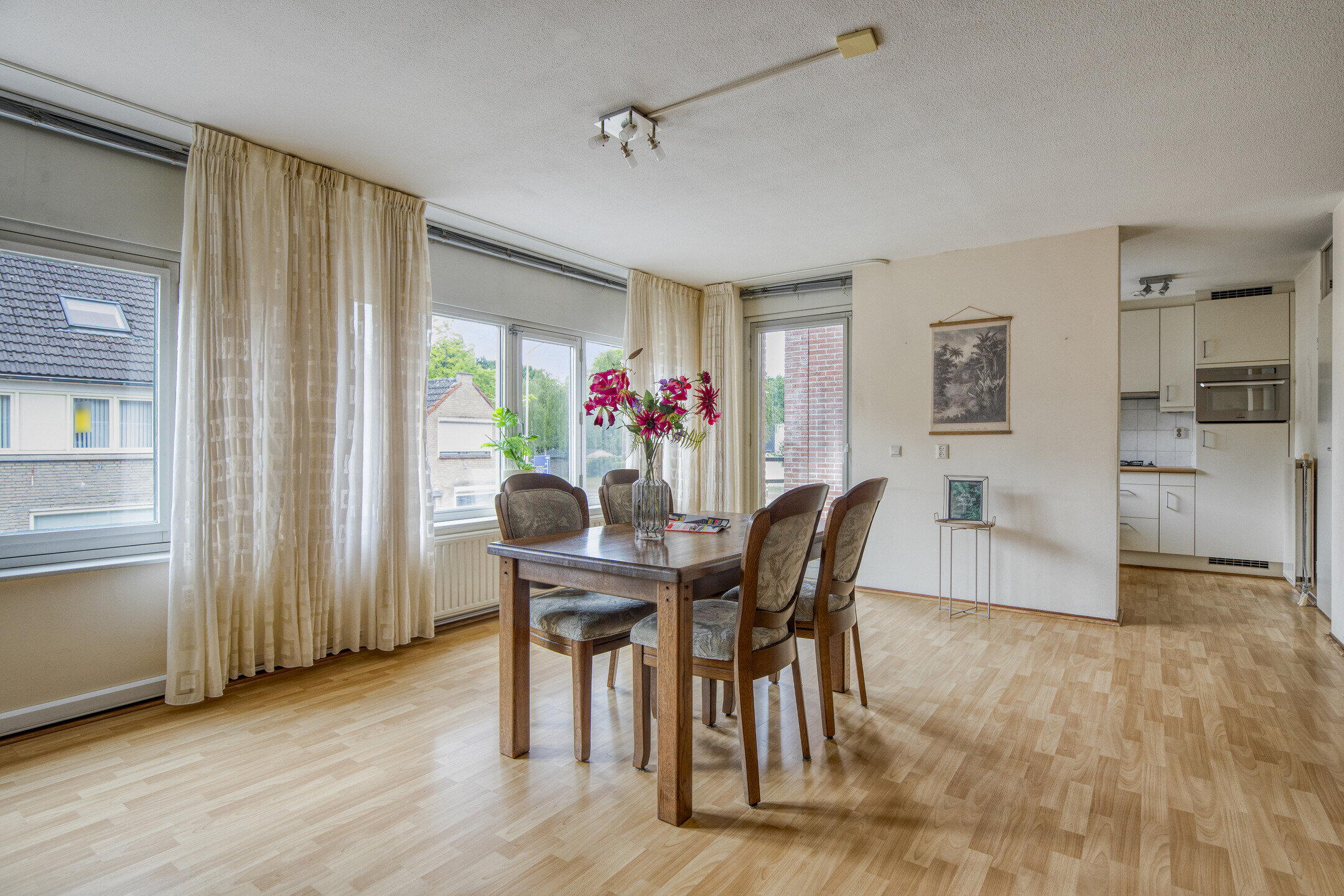 De woonkamer is opvallend ruim en licht, met volop plek voor een fijne zit- én eethoek. Via de grote ramen en deur aan de achterzijde valt het daglicht rijkelijk naar binnen, en je loopt zo het eerste balkon op.