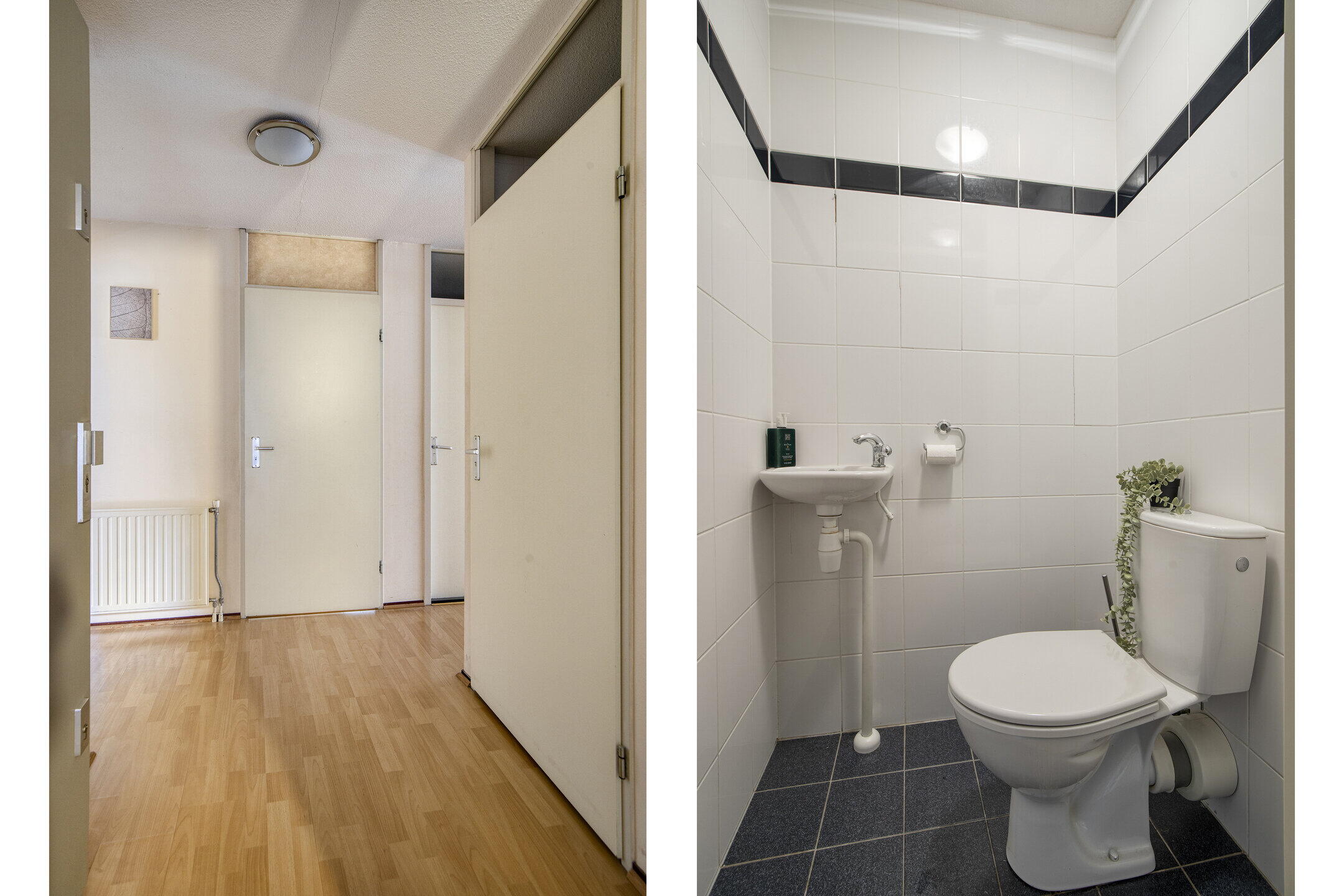 Je komt het appartementencomplex binnen via een nette gezamenlijke hal. De lift of trap brengt je naar de eerste verdieping, waar de woning is gelegen. Achter de voordeur vind je een ruime hal met meterkast, separaat toilet en toegang tot de slaapkamers, badkamer en woonkamer.