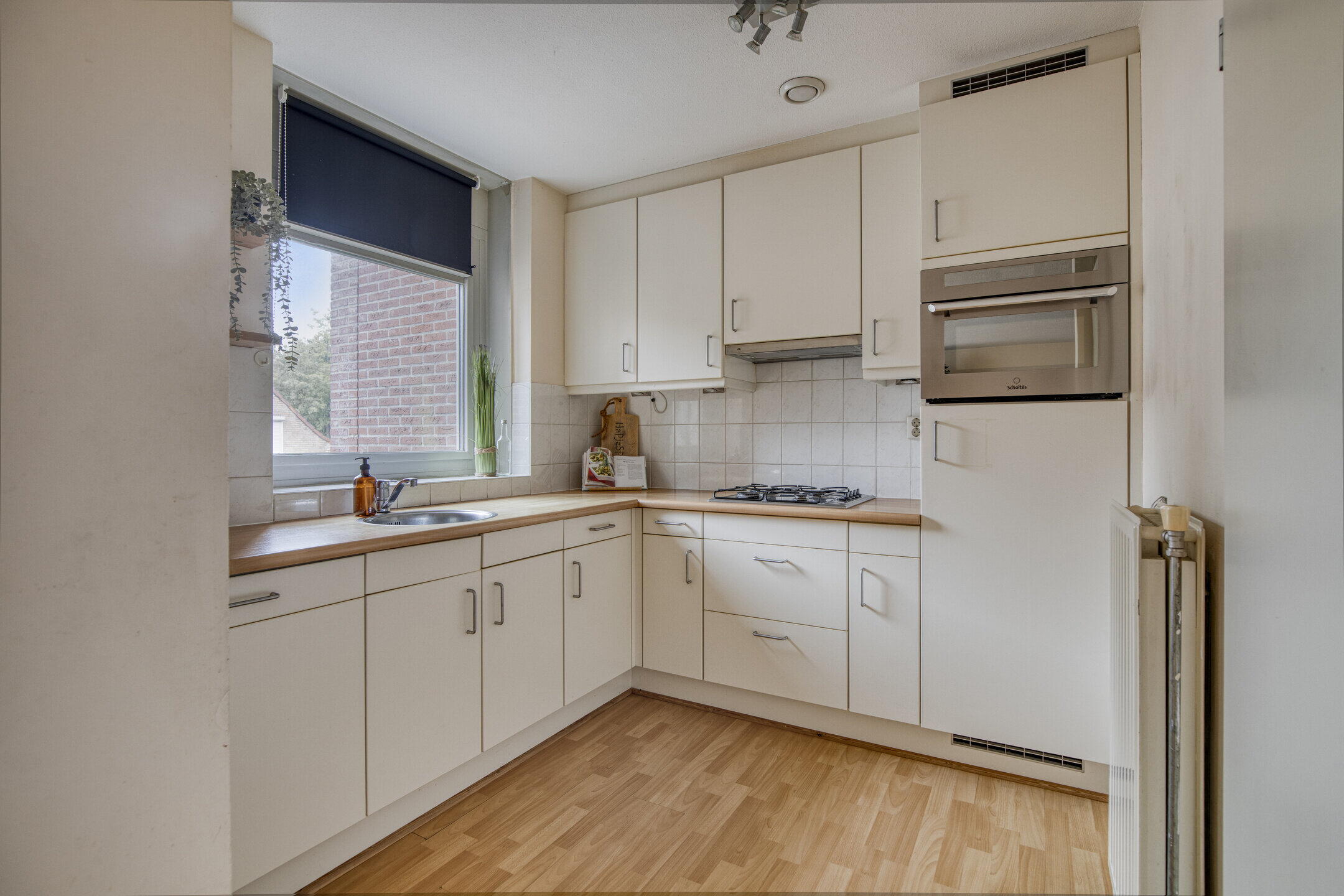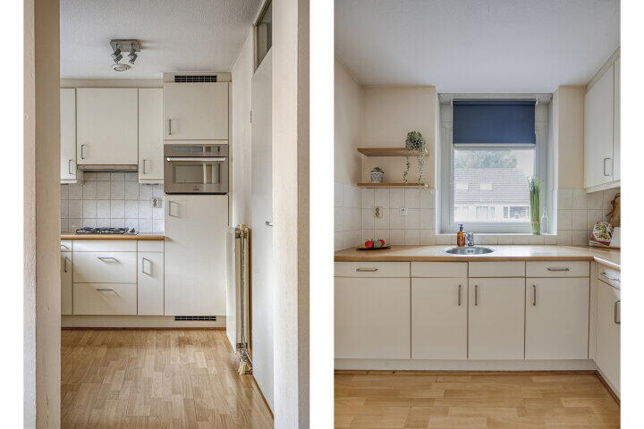 De halfopen keuken in hoekopstelling is uitgevoerd in een lichte kleurstelling en voorzien van diverse inbouwapparatuur, waaronder een fornuis, afzuigkap, combi-oven, koelkast en vaatwasser. Vanuit de keuken heb je toegang tot een praktische bijkeuken met wasmachineaansluiting.