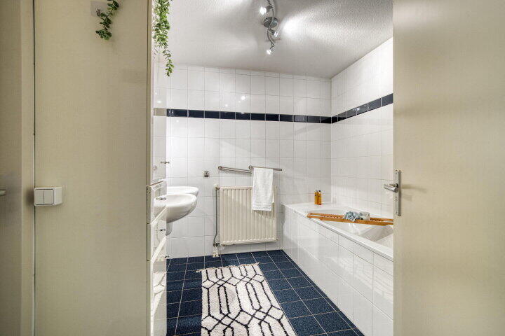 De badkamer is compleet met een ligbad, douche en dubbele wastafel – alles wat je nodig hebt voor een frisse start of ontspannen einde van je dag.